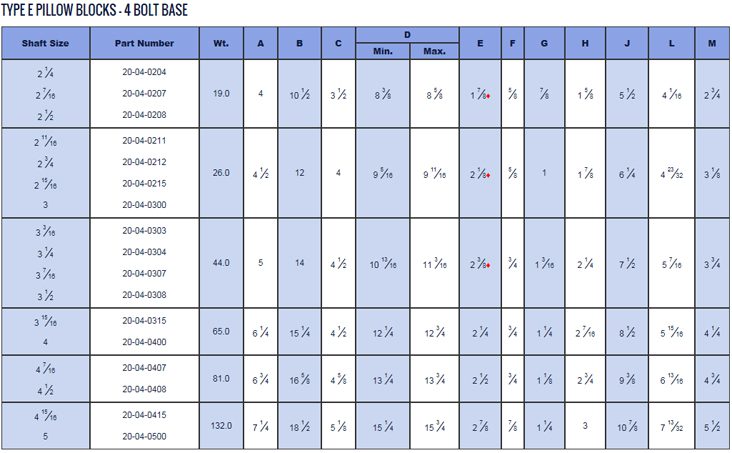 Pillow Block, Type E, 4-Bolt Base, Bore Diameter 4-15/16″ with genuine Timken Enhanced DEE Tapered Roller Bearings, Dual Locking Collars and Dual Lip, Medium Contact Seals